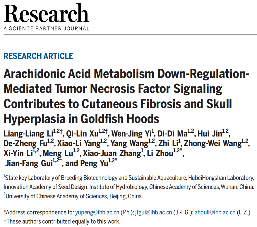 近期,中國科學(xué)院水生生物研究所桂建芳院士團隊在Research上發(fā)表了題為“Arachidonic acid metabolism downregulation-mediated TNF signaling contributes to cutaneous fibrosis and skull hyperplasia in goldfish hoods”的研究論文,團隊發(fā)現(xiàn),獅頭金魚的頭瘤本質(zhì)上是一種皮膚纖維化結(jié)構(gòu),富含纖維型膠原蛋白;進一步研究揭示,花生四烯酸代謝的下調(diào)通過引起TNF信號通路的異常表達,促進膠原蛋白異常沉積與顱骨結(jié)構(gòu)改變,從而驅(qū)動頭瘤的形態(tài)發(fā)生。該研究不僅首次系統(tǒng)解析了金魚頭瘤形成的細胞與分子機制,為觀賞魚性狀選育提供了理論依據(jù),也為人類纖維化疾病的研究提供了新的視角。